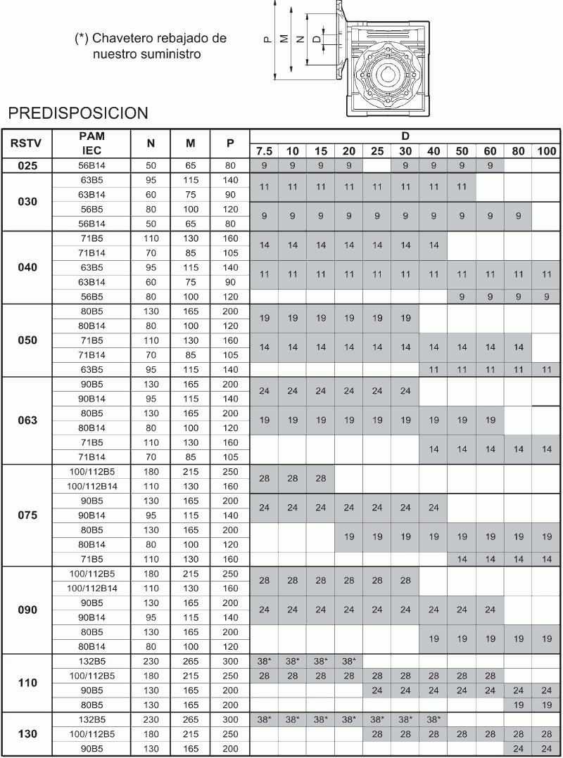 Relación de reducción para modelo RSTV-25: i= 7,5-10-15-20-30-40-50-60.