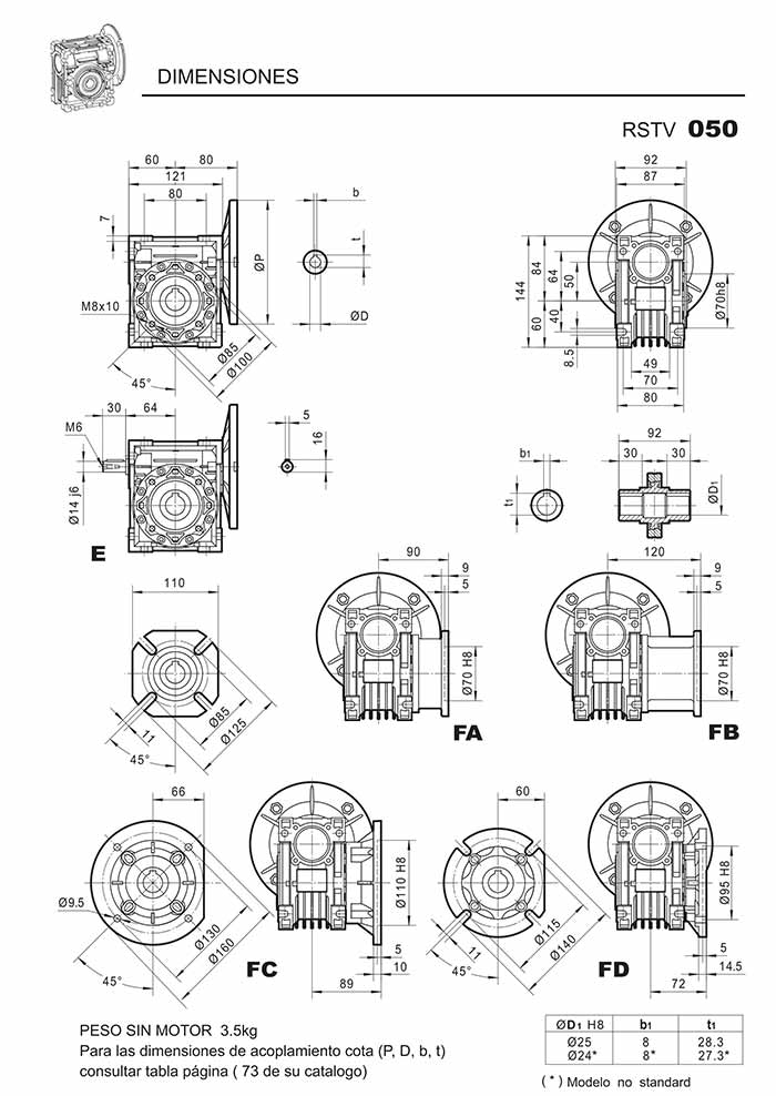 | Modelo | D (mm) | M (mm) | N (mm) | P (mm) | S (mm) | d (mm) | Q (mm) | E (mm) | L (mm) |