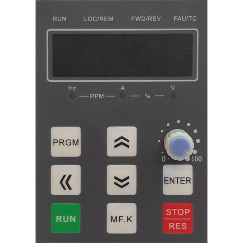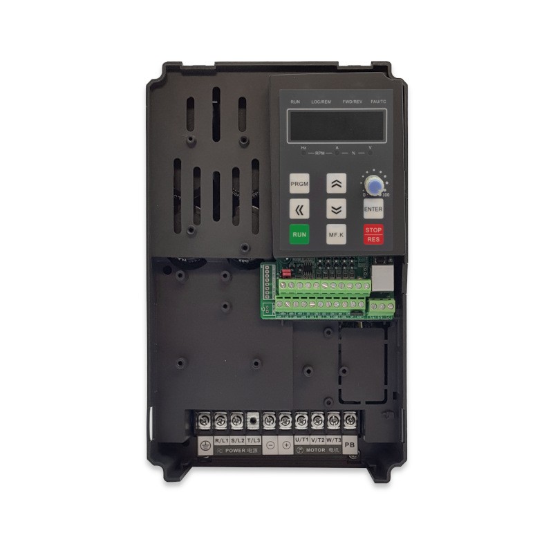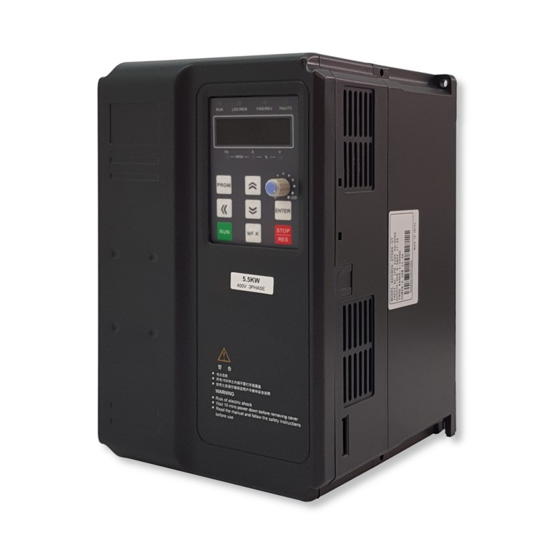 Con este variador de frecuencia se puede convertir la corriente monofásica a 220V a trifásica 380 V para poder conectar motores eléctricos 380 V que no tengan la posibilidad de conectarse a corriente trifásica 220V.