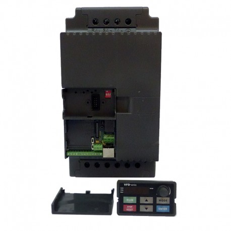 El variador de frecuencia trifásico está diseñado para ser fácil de usar, con un teclado desmontable que facilita la configuración y el monitoreo. La función PLC integrada permite la programación de hasta 500 pasos, ofreciendo capacidades avanzadas de automatización. Además, cuenta con la función PTC, DI NPN/PNP, y conexión RS485 Modbus con una velocidad de transmisión de hasta 38400 bps para una comunicación eficiente con otros dispositivos.
