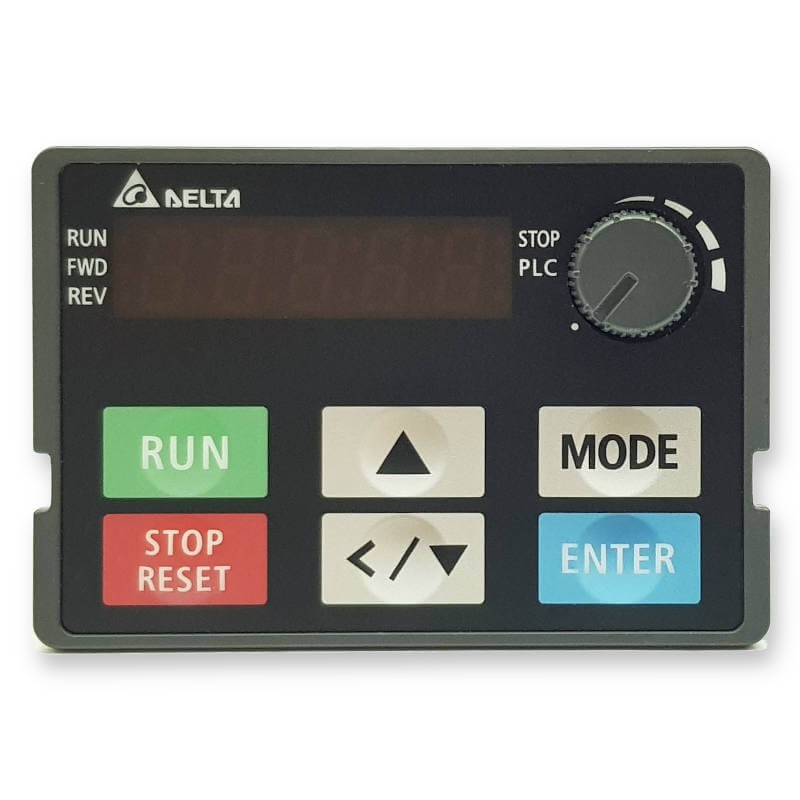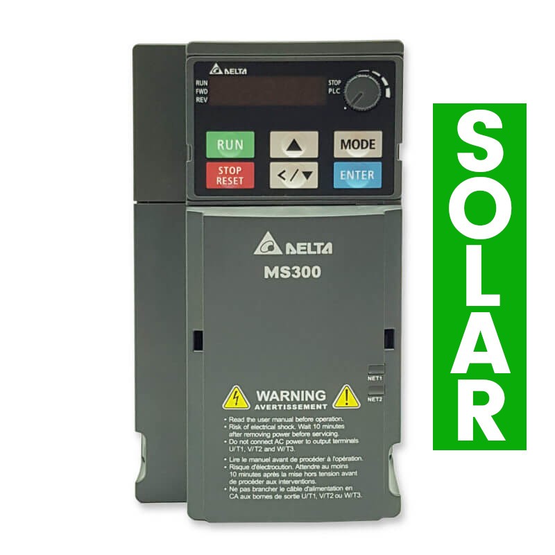 Variador de frecuencia de la marca Delta, modelo MS300 con conexión de alimentación mediante placas solares, alimentación directa de la red trifásica y mediante conexión de ambas a la vez. Mediante la programación suministrada de serie, el equipo gestiona automáticamente la energía, priorizando las placas solares e inyectando la energía faltante de la corriente alterna, aunque también se puede alimentar únicamente de los paneles fotovoltáicos o mediante corriente alterna según las necesidades de cada momento.