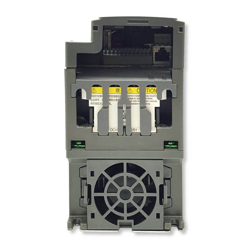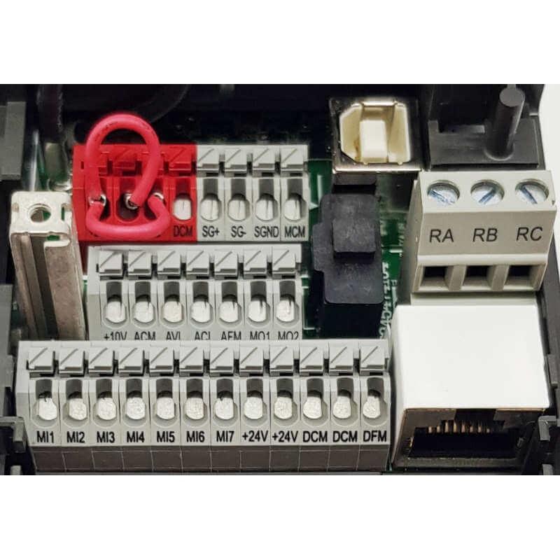 Variador de frecuencia de la marca Delta, modelo MS300 con conexión de alimentación mediante placas solares, alimentación directa de la red trifásica y mediante conexión de ambas a la vez. Mediante la programación suministrada de serie, el equipo gestiona automáticamente la energía, priorizando las placas solares e inyectando la energía faltante de la corriente alterna, aunque también se puede alimentar únicamente de los paneles fotovoltáicos o mediante corriente alterna según las necesidades de cada momento.